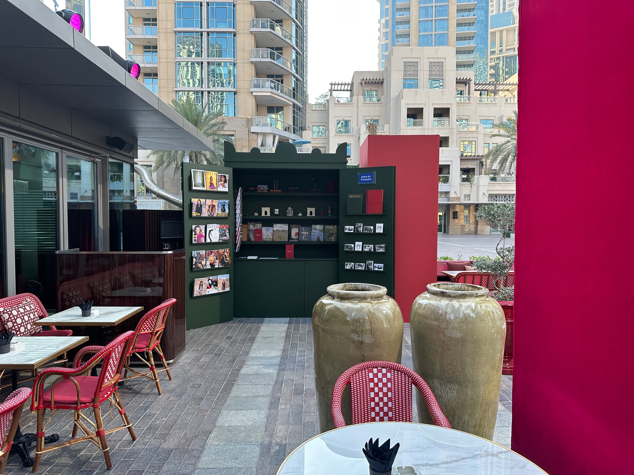 Magan a réalisé l’ensemble du décor pour les besoins de l’inauguration du Fouquet’s : moquette rouge extérieur, fourniture des plots, habillage des scènes, décors de scène, rideaux, fabrication en atelier de la colonne Morris et habillage, fabrication en atelier du kiosk à journaux, habillage en menuiserie du jardin, cloison pour les régies.